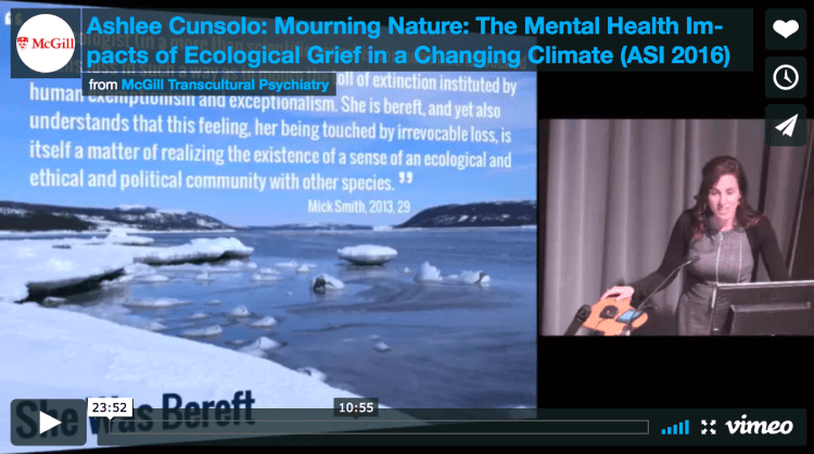 - Cunsolo, A. and Ellis, N. (2018). Ecological grief as a mental health response to climate change-related loss. Nature Climate Change (invited Perspective piece), 8: 275-281.